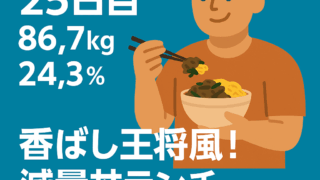 ダイエット25日目。体重86.7kg・体脂肪率24.3%。お昼は王将風「きのこと卵の入りつけ丼」。ごま油とオイスターソースで香ばしく仕上げ、満足感のある減量ランチに。