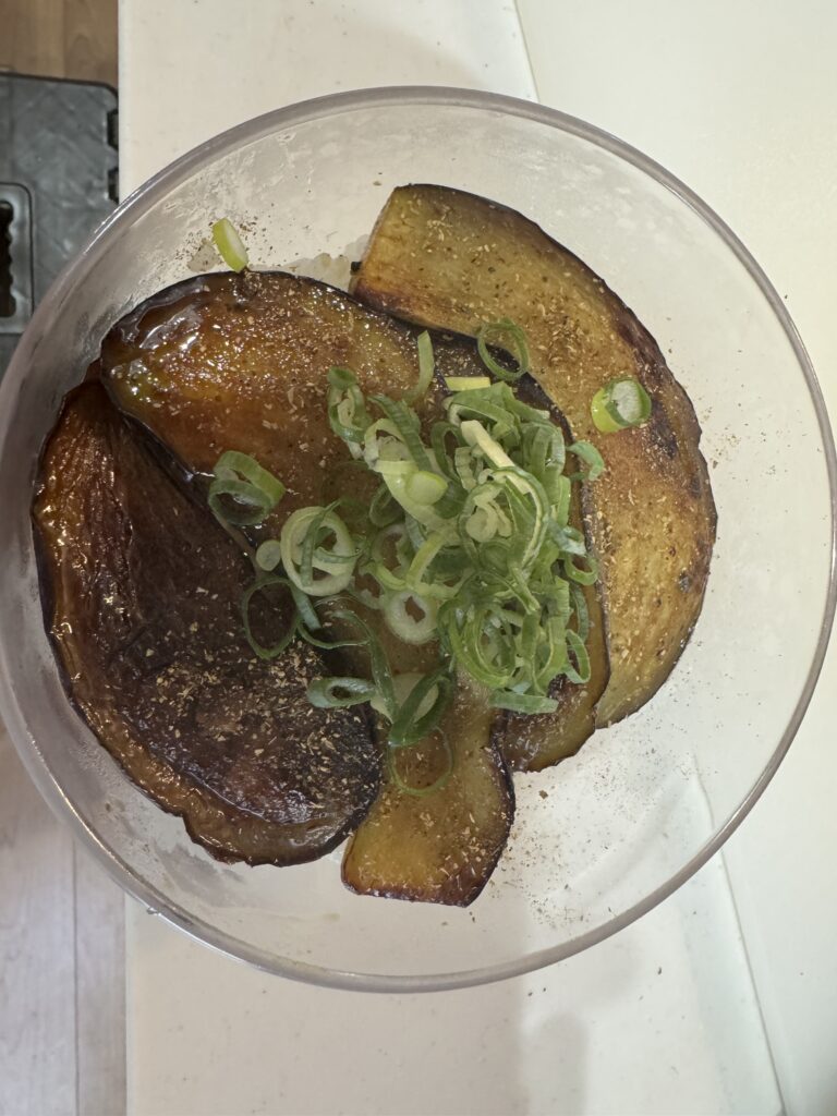 - フライパンにサラダ油を少々ひき、ナスを焼く