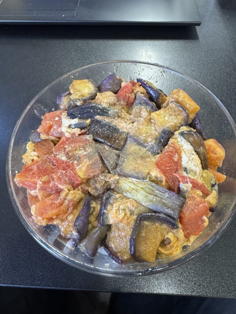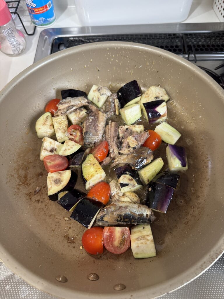- フライパンにバターを熱し、ナス・トマト・イワシを炒める。