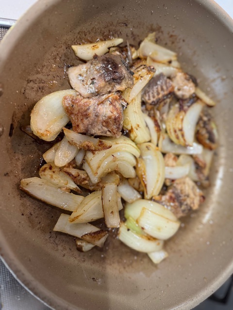 - 串切りにした玉ねぎを入れ、焦げ目がつく程度に炒める。