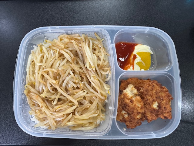 (もやし丼:約250kcal、チキンナゲット:約150kcal)